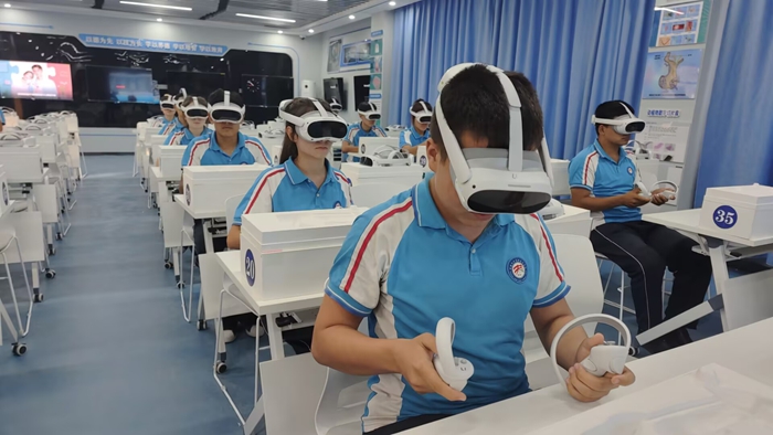 宽敞明亮的现代化VR实验室里,畜牧兽医班的学生正戴着VR眼镜,用手柄进行虚拟实验操作。“与其我在班里跟他说肺下面是心脏等等,还不如直接让他们来进行一个解剖,这个来得太实在了。”农牧VR室负责人阿迪莱·阿布拉江11日对记者表示,“我们以前采用传统的教学,现在用智慧化教学之后,上课过程会更加生动,然后也能更进一步地激发学生的兴趣。”