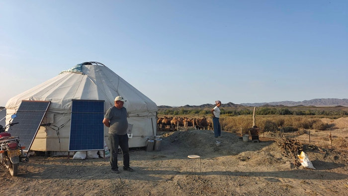 在阿勒泰地区青河县萨尔托海乡别斯铁热克村附近的夏牧场上,夕阳里炊烟升起,牧民木拉提·毕木拉点开手机,骆驼的实时位置一目了然。